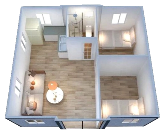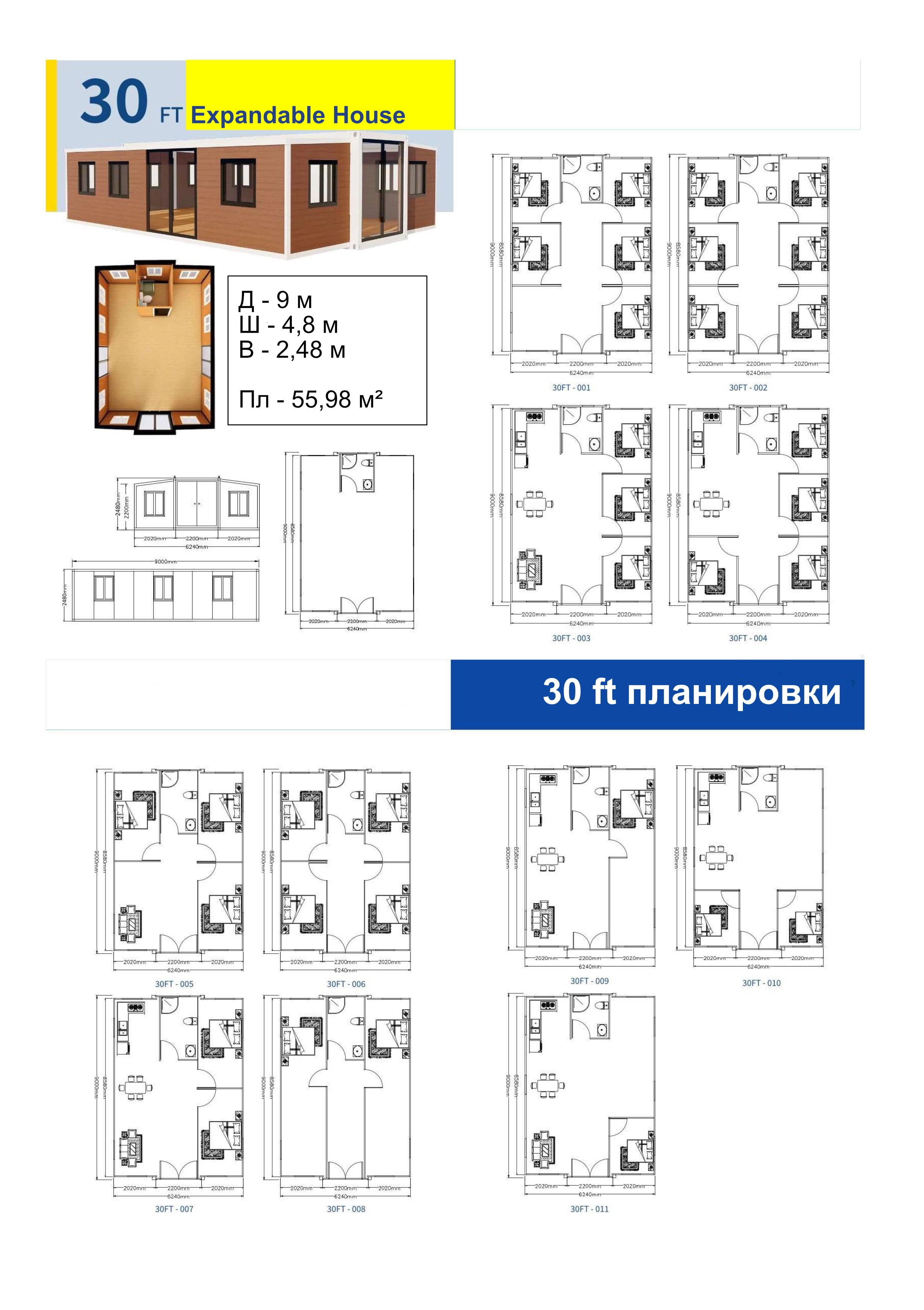 Two-section sliding modules differ in area. Standard Expandable House configurations are made with a wide middle part of 2200 mm and differ in total length from 5900 to 11500 mm. In the unfolded state, these modules have a total facade width of 6240 mm.
