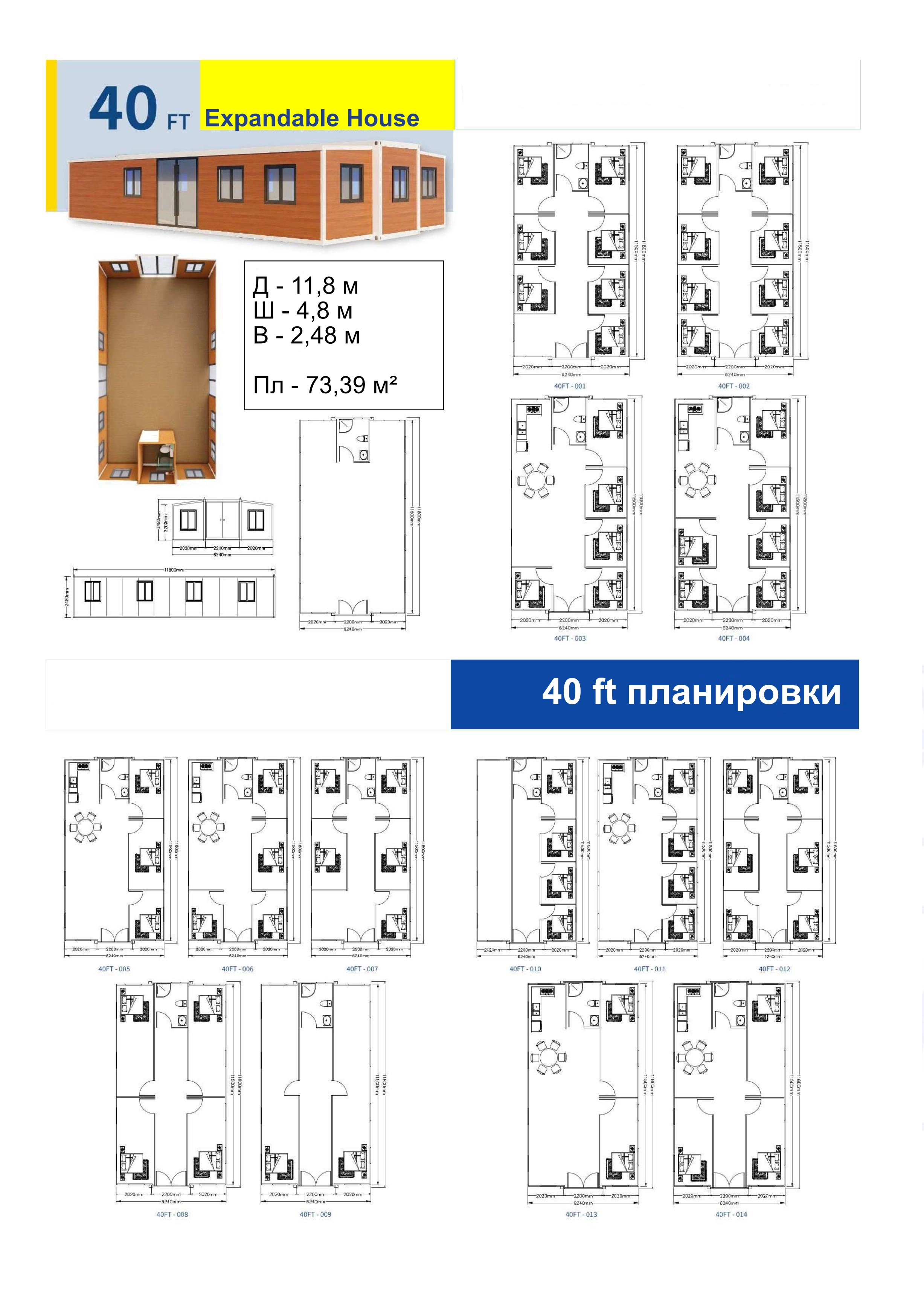 Двухсекционные раздвижные модули различаются по площади. Стандартные комплектации Expandable House выполнены с широкой средней частью 2200 мм и отличаются по общей длине от 5900 до 11500 мм. В разложенном состоянии эти модули имеют общую ширину фасада 6240 мм.